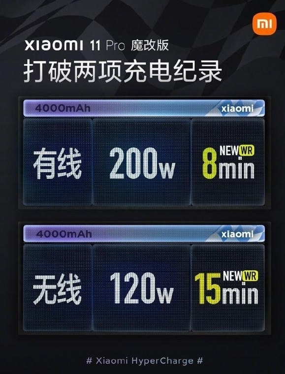 今年5月31日小米公布了200W有线快充和120W有线快充技术,充满4000mAh电池仅需要8分钟和15分钟时间,充电速度在行业主流之上。